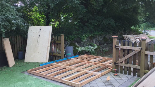 GARDEN SHEDS: Starting with one floor section, position stones around its perimeter and specific joists. (For details, see specific instruction manual) Use a 2x4 straight piece of lumber on edge and a carpenter’s level to position correctly. Add or remove soil/sand under each stone until level. Complete remaining floor sections in the same manner. When all floor panels are level with each other, flip over, screw together and place back on level foundation.
